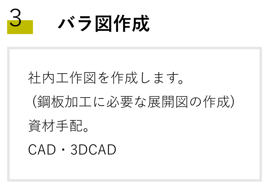 社内工作図を作成します。 (鋼板加工に必要な展開図の作成) 資材手配。