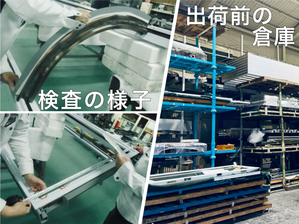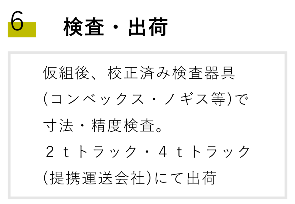 仮組後、校正済み検査器具(コンベックス・ノギス等)で寸法・精度検査。2tトラック・4tトラック (提携運送会社)にて出荷
