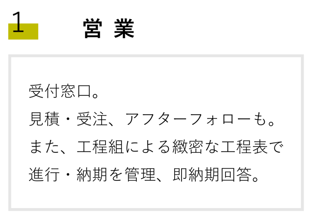 受付窓口。見積・受注、工程組で即納期回答。緻密な工程表で進行・納期を管理。アフターフォローも。